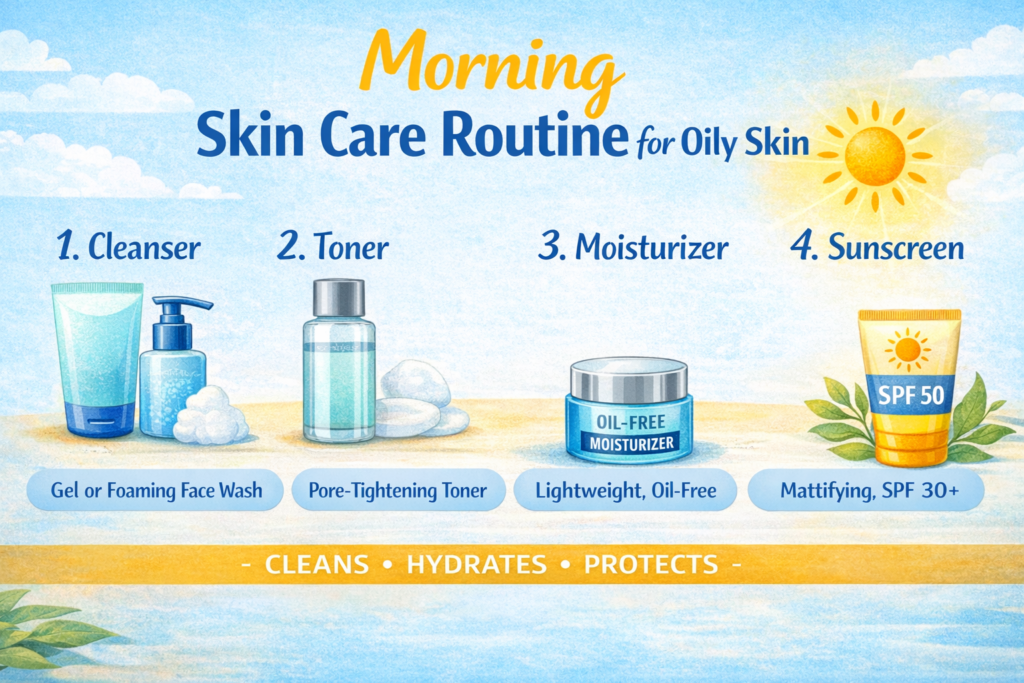 Your morning routine should focus on cleansing excess oil, protecting your skin, and keeping shine under control throughout the day.